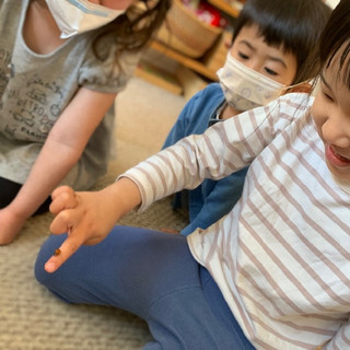 ある日の保育、えりこ先生がたくさんのてんとう虫を持ってきてくれました。大喜びで手に乗せる子、恐る恐る近寄って観察する子など楽しい時間を過ごしました。工作のてんとう虫も、上手にできました。