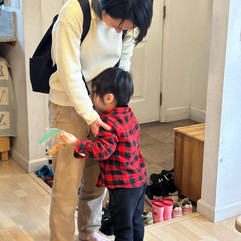 トイレの後、オムツを変えた後、自分でズボンを履く練習をしています。最初はちょっとサポートが必要ですが、みんな上手に履けるようになってきました。ご自宅でもぜひ継続してみてください。